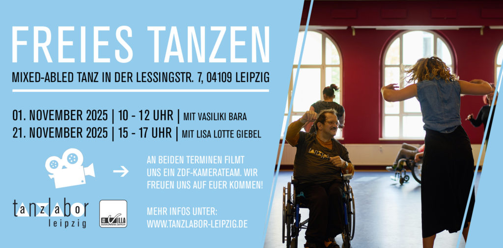 - FREIES TANZEN: Das nächste Freie Tanzen findet im November am Freitag, den 21. November 2025 von 15-17 Uhr statt. Ein ZDF-Kamerateam filmt uns beim Tanzen. Zeigen wir der Welt unser Tanzlabor! Wir freuen uns auf euer Kommen.